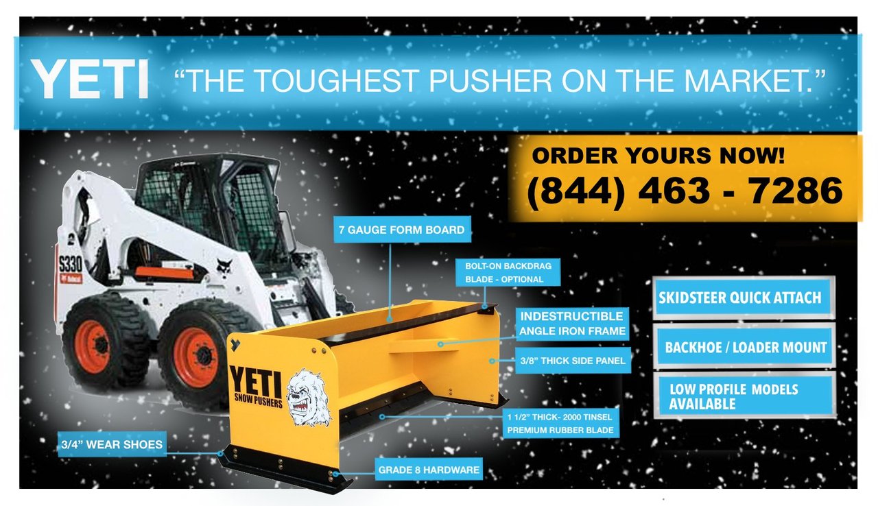 Our Yeti Snow pushers are built for tough cold winters, to take the impact of parking lot curbs and remain in one piece. If your machine is behind a Yeti Backhoe or Skid Steer pusher there is nothing that will stop you from getting the job done fast.